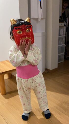 こんにちわ。 先日節分行事を家族で行いましたが、娘は鬼の面が怖くて「こわぃ〜こわぃ〜」と言い、それから一向に鬼の面には近づく事はありませんでしたが、ある日少し慣れたのか鬼の面を被り、私たちの前に現れました。 もちろん、私たちの反応は「こわぃ…
